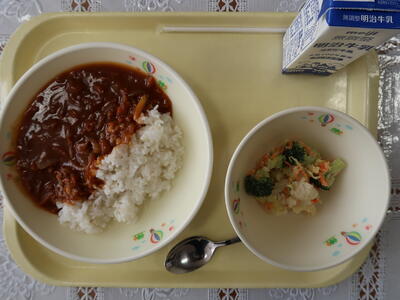 【給食メニュー】麦ご飯、牛乳、ハッシュドポーク、シーザーサラダです。トマトがベースになっているハッシュドポークはまろやかで、口の中でとろけるような味わいが最高です。ごちそうさまでした。