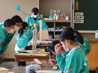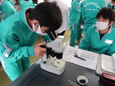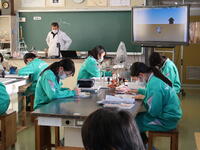 1年3組「理科」火山灰を顕微鏡で確認していました。