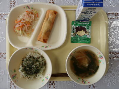 【給食メニュー】ご飯、ふりかけ、牛乳、春巻き、中華くらげ和え、ワンタンスープです。1月24日~31日は「全国学校給食週間」です。明治22年(1889年)に山形県の小学校で出されたのが始まりと言われています。これからも美味しい給食で元気で大きく成長できるよういただきます。ごちそうさまでした。