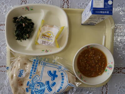 【給食メニュー】ナン、牛乳、辛くないインドカレー、ツナのり酢和え、レモンタルトです。今日のメニューは阿久津小学校のリクエストメニューで、ツナのり酢和えとレモンタルトが人気のメニューのようです。「ナン」はインドのパンのようなもので、カレーを付けて食べたり、野菜や果物を挟んで食べているようです。日本人もナンを食べる機会が増えていますね。ごちそうさまでした。