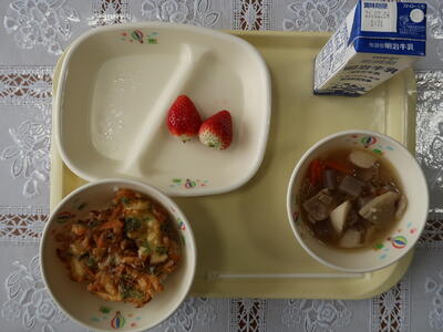 【給食メニュー】セルフかき揚げ丼、牛乳、豚汁、いちごです。このいちご(とちおとめ)はJAしおのや様から無償でいただいたものだそうです。栃木県は生産量・収穫量とも日本一です。栃木県は冬の日照時間が長く、昼と夜の寒暖の差が大きい気候で、この気候が生育に適しているのだそうです。とてもあまくて美味しかったです。ごちそうさまでした。