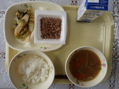 【給食メニュー】ご飯、牛乳、納豆、かんぴょうごま酢和え、すいとん汁でした。かんぴょうは日本の生産量の80%以上も栃木県で生産される伝統的な食材です。今日も美味しくいただきました。ごちそうさまでした。