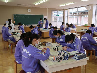 3年3組「家庭」ブックカバーをつくっていました。これを使って高校通学の際の「読書」に活用してほしいですね。