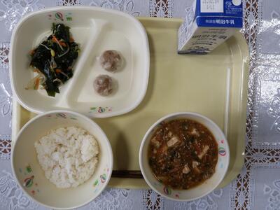 【給食メニュー】麦ご飯、牛乳、マーボ豆腐、焼売、ナムルです。今日のメニューは「中華風」でどの食品も辛さ控えめで、小学生でも美味しく食べられるよう工夫されていました。ごちそうさまでした。