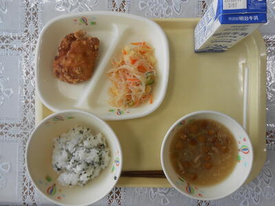 【給食メニュー】わかめご飯、牛乳、から揚げ、春雨サラダ、なめこ汁です。なめこはモエギダケ科スギタケ属と呼ばれるきのこの一種で、日本では味噌汁の定番です。ぬるぬるとした粘質が特徴の栄養価の高いきのこで、飲み込んだ後の温かさは最高です。ごちそうさまでした。