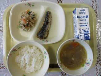 今日の給食は、かみかみメニューで、ご飯、牛乳、いわしごま味噌煮、切干大根とツナの和え物、豚汁です。高根沢町で生産されたものは、味噌、米です。今日もたいへんおいしく頂きました。