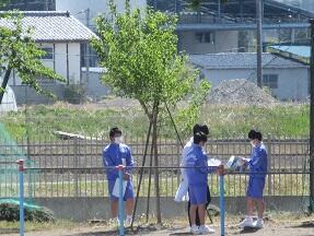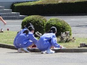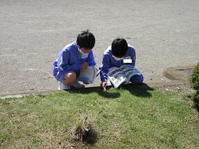 春の生物を見つけるために、校庭のいろいろな場所で観察していました。