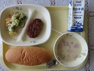 今日の給食は、コッペパン、牛乳、ハンバーグ、シーザーサラダ、白いんげん豆のポタージュです。今日もたへんおいしく頂きました。