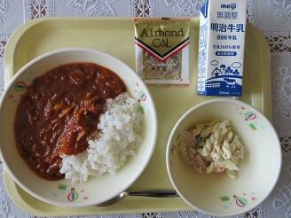 今日の給食は、ハヤシライス(ご飯・ハヤシルウ)、牛乳、マカロニサラダ、小魚アーモンドです。高根沢町で生産されたものは、トマト、きゅうり、米です。今日もたいへんおいしく頂きました。