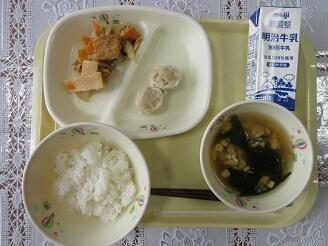 今日の給食は、ご飯、牛乳、えび焼売、生揚げの味噌炒め、わかめと卵のスープです。高根沢町で生産されたものは、味噌、しいたけ、米です。今日もたいへんおいしく頂きました。