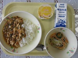 今日の給食は、マーボー丼(ご飯・マーボー丼の具)、牛乳、春雨サラダ、レモンゼリーです。高根沢町で生産されたものは、味噌、豆腐、きゅうり、キャベツ、ねぎ、米です。今日もたいへんおいしく頂きました。