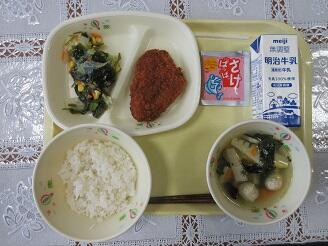 今日の給食は、麦ご飯、牛乳、かつおフライ、海そうサラダ、肉団子スープ、ふりかけです。高根沢町で生産されたものは、きくらげ、米です。今日もたいへんおいしく頂きました。