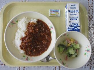 今日の給食は、ご飯、牛乳、ハッシュドポーク、サラミソーセージとブロッコリーのサラダ、チーズです。高根沢町で生産されたものは、トマト、玉ねぎ、キャベツ、米です。今日もたいへんおいしく頂きました。