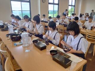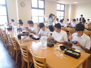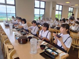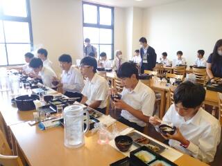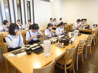 1日目の昼食は、「伊達の牛たん本舗」です。コロナ感染症予防対策のため、クラス男女別の前向きですがみんなとてもおいしそうに食べています。