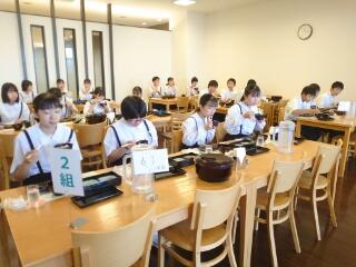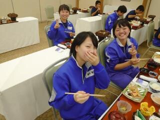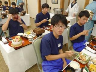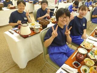 修学旅行2日目の朝食です。ちょっと疲れ気味の生徒もいるようですが、全員元気です。