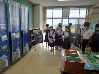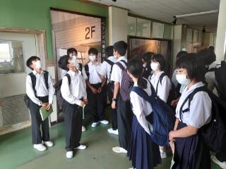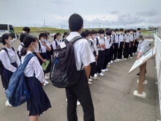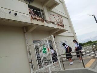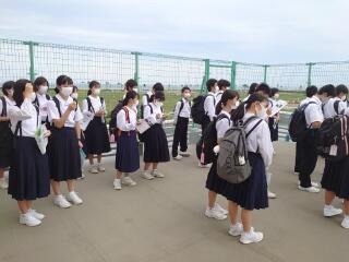 修学旅行最初の見学地は、震災遺構仙台市立荒浜小学校です。曇り空ですが、ちょっと蒸し暑さを感じます。