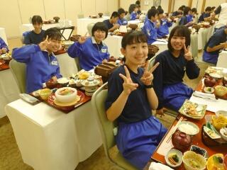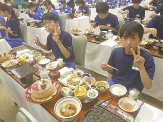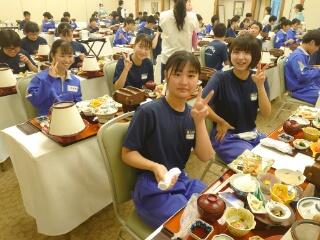 1日目の夕食です。こちらもコロナ感染症予防対策で全員前向きです。みんなおいしそうに食べています。修学旅行では、考えられないくらい豪華なメニューです。
