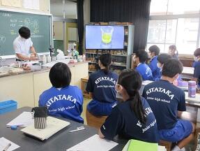塩酸に水酸化ナトリウムを入れて中和させる実験をやってました。実物投影機を使ってとても見やすいと感じました。