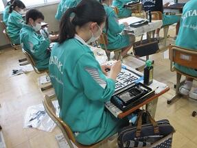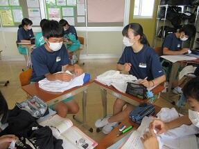 自分が持ってきた既製服の表示から生産国、素材、洗濯方法などを調べてグループで発表していました。みんな意欲的に活動していました。