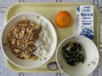 今日の給食は、マーボー丼(麦ご飯、マーボー丼の具)、牛乳、わかめともやしのナムル、冷凍みかんです。高根沢町で生産されたものは、豆腐、味噌、しいたけ、米です。今日もたいへんおいしく頂きました。