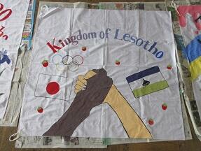 以前お知らせした、レソト王国の手作り応援旗制作が、順調に進んでいます。今日、授業を見て歩いているときに3階の学習室にあったので、写真を撮ってきました。とたもいい応援旗が出来上がってきています。15日までに町の教育委員会提出なので、出来上がったら学校に1度掲示して、全生徒に見せたいと考えています。