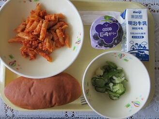 今日の給食は、牛乳パン、牛乳、ミートソースペンネ、グリーンサラダ、巨峰ゼリーです。高根沢町で生産された物は、大豆、アスパラガス、にんじん、玉ねぎです。今日もたいへんおいしく頂きました。