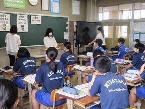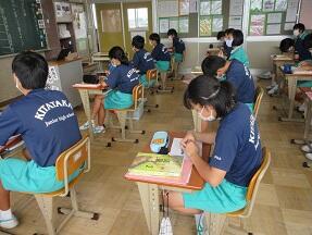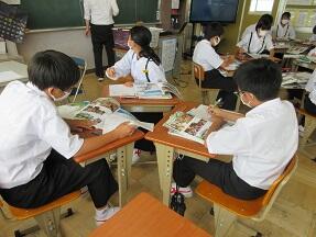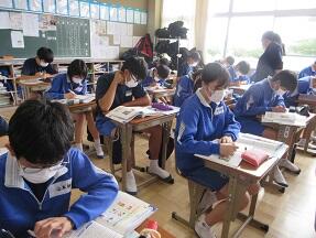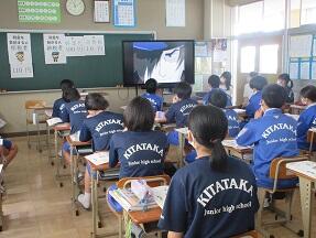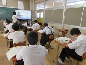 少人数で実施していましたが、どちらも本文を理解するためにいろいろな活動を展開していました。電子黒板が使われ丁寧に授業が進められていました。