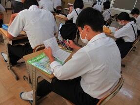 今日の6校時に、1年生がマイタイムラインを実施しました。マイタイムラインとは、河川の水位が上昇するときに、自分自身がとる標準的な防災行動を時系列的に整理し、とりまとめる行動計画表のことです。生徒たちは、講師の方々の話を聞いた後に、真剣に取り組んでいました。危機意識を高めるとてもよい機会になりました。