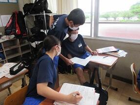 化学変化と物質の質量の復習で、プリントの問題を解いていました。真剣に取り組む中にも、学び合う姿も見られました。