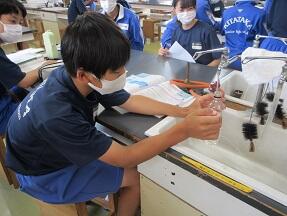 ガスバーナーの使い方について説明を受け、実際に火をつける練習をしていました。みんなちょっと怖そうでしたが、火をつけることができていました。