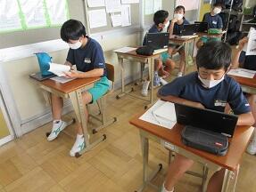 夏休みの自由研究のテーマを決めるために、インターネットや今までの理科研究の冊子を見ていました。みんなテーマを決めるために真剣でした。