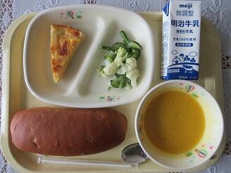 今日の給食は、町内産ブルーベリーパン、牛乳、アンサンブルエッグ、グリーンサラダ、かぼちゃのスープです。高根沢町で生産されたものは、ブルーベリー、玉ねぎ、きゅうりです。今日もたいへんおいしく頂きました。