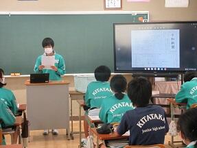 本文の内容理解に入る前の導入をやっていました。しっかり授業の流れを生徒たちに示しての授業で、1時間の流れがよくわかるように工夫していました。