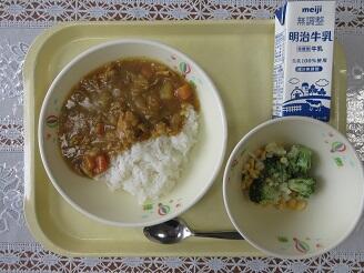 今日の給食は、ご飯、牛乳、ポークカレー、コーンサラダです。高根沢町で生産された物は、玉ねぎ、米です。今日もたいへんおいしく頂きました。