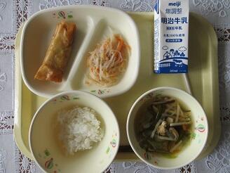 今日の給食は、ご飯、牛乳、春巻、中華くらげ和え、茎わかめの中華スープです。高根沢町で生産された物は、きゅうり、干ししいたけ、米です。今日もたいへんおいしく頂きました。