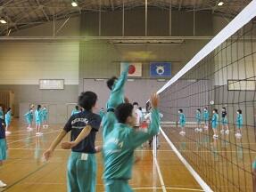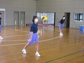 男子はバレーボール、女子はソフトボールに取り組んでいました。どちらも協力してゲームが進められていました。