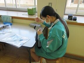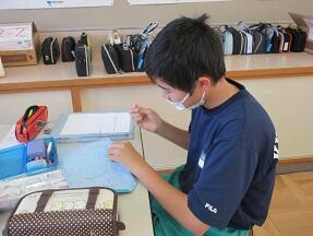 ブックカーバーづくりが順調に進んでいるようで、今日はカラーテープを間にはさんでしつけ縫いをしていました。もう少しで完成になります。