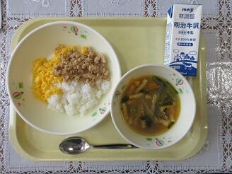 今日の給食は、二色丼(ご飯・大豆入り鶏そぼろ・卵そぼろ)、牛乳、田舎汁です。高根沢町で生産された物は、味噌、玉ねぎ、なす、米です。今日もたいへんおいしく頂きました。