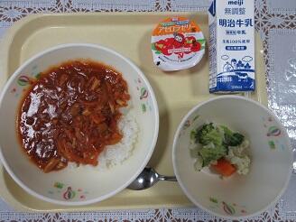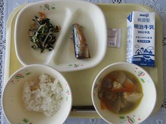 今日の給食は、麦ご飯、牛乳、ポークカレー、ひじきのサラダです。高根沢町で生産されたものは、玉ねぎ、米です。今日もたいへんおいしく頂きました。