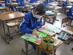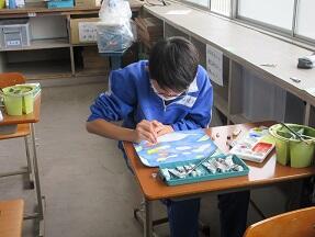 風景画の彩色をしていましたが、立体感が出るように工夫しながら彩色していました。なかなかよい作品が出来上がりそうです。