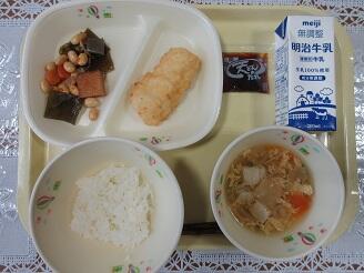 今日の給食は、ご飯、牛乳、野菜コロッケ、変わりきんぴら、大根と油揚げの味噌汁です。高根沢町で生産されたものは、味噌、ねぎ、米です。今日もたいへんおいしく頂きました。
