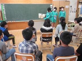 2人組で本時で出てくる単語の発音練習と意味の確認を行っていました。とてもよい雰囲気で授業が展開されていました。