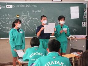 後置修飾を使ってクイズを作るという活動の導入を行っていました。とても楽しい雰囲気で授業が展開されていました。