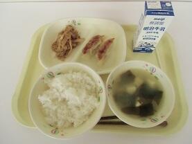 今日の給食は、ご飯、牛乳、えび焼売、ナムル、生揚げと大根のオイスターソース煮です。高根沢町で生産された物は、米です。今日もたいへんおいしく頂きました。