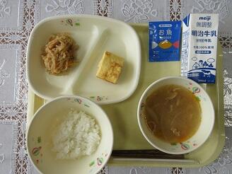 今日の給食は、ご飯、牛乳、野菜コロッケ、変わりきんぴら、大根と油揚げの味噌汁です。高根沢町で生産されたものは、味噌、ねぎ、米です。今日もたいへんおいしく頂きました。