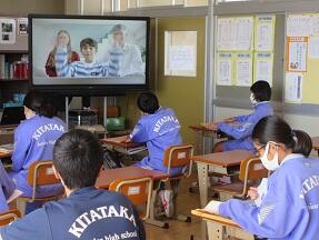 前置詞についての学習が展開されていました。電子黒板を有効に使って学習が進められていました。