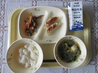 今日の給食は、ご飯、牛乳、焼き餃子、豚肉と野菜の味噌炒め、干ぴょう入り団子汁です。高根沢町で生産された物は、味噌、きくらげ、米です。今日もたいへんおいしく頂きました。