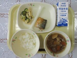 今日の給食は、ご飯、牛乳、さばの味噌煮、干ぴょうごま酢和え、のっぺい汁です。高根沢町で生産された物は、舞茸、米です。今日もたいへんおいしく頂きました。