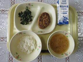 今日の給食は、麦ご飯、牛乳、ハンバーグステーキソース、ツナのり酢和え、大根と油揚げの味噌汁です。高根沢町で生産された物は、味噌、ねぎ、米です。今日もたいへんおいしく頂きました。
