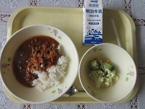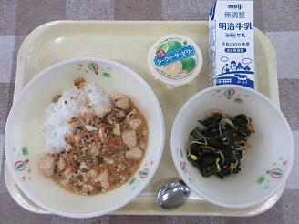 今日の給食は、マーボー丼(ご飯 マーボー丼の具)、牛乳、わかめともやしのナムル、シークワーサーゼリーです。高根沢町で生産されたものは、味噌、豆腐、にんじん、ねぎ、米です。今日もたいへんおいしく頂きました。